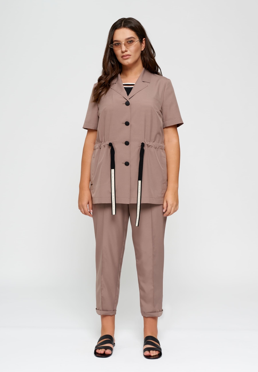 Блуза женская, удлиненная, прямого силуэта, с короткими втачными рукавами и пиджачного типа воротником. По переду жакета на уровне линии талии кулиса с декоративным шнуром и прорезные карманы с листочками. По боковым швам разрезы. Застежка блузы центральная на петли и пуговицы.