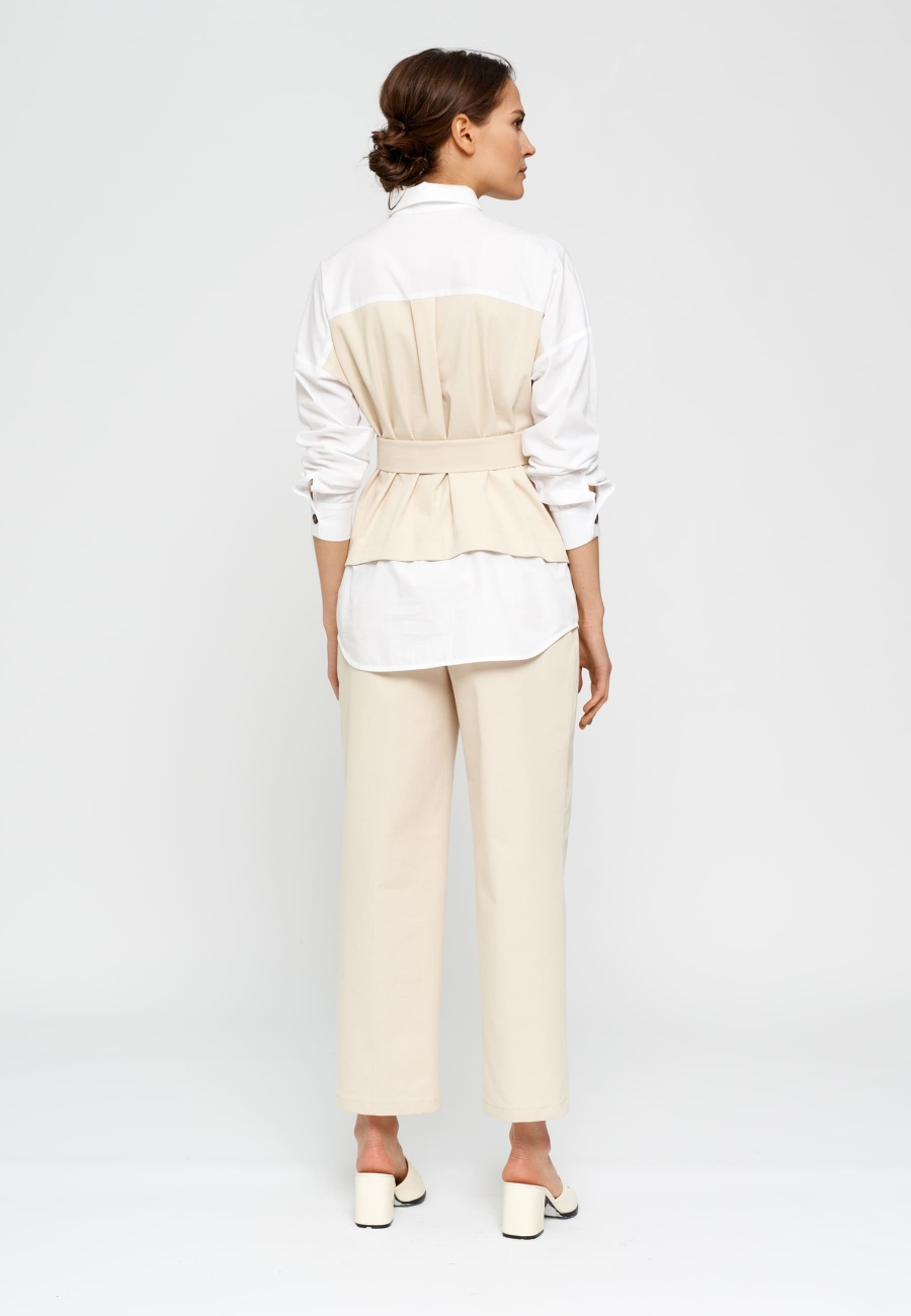 Блузка женская, прямого силуэта, состоящая из двух видов ткани. Воротник рубашечного типа. Рукава рубашечного кроя на манжетах. Застежка планка на петли и пуговицы. Декоративные клапаны от кокетки переда. Пояс съемный с пряжкой.
