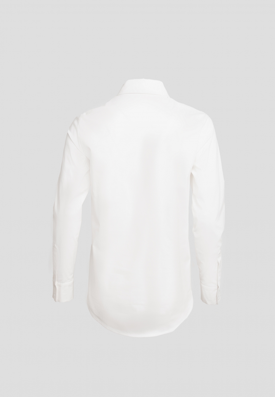 Блузка прямого силуэта, умеренной длины, рубашечный рукав на притачной манжете на петли и пуговицы. По горловине воротник на стойке. Правая пола с отлетной декоративной кокеткой и декоративной рамкой. Застежка центральная на петли и пуговицы. Вверху часть застежки расположена под кокеткой.