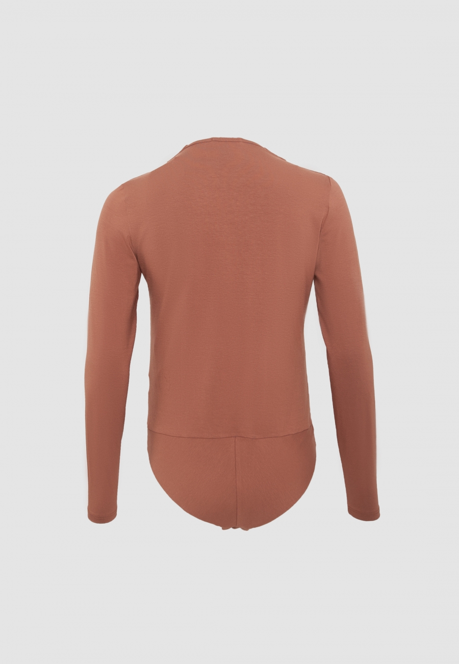 Блузка-боди женская. Рукава втачные, V-образный вырез горловины, по переду запах и односторонние складки от плечевых швов.