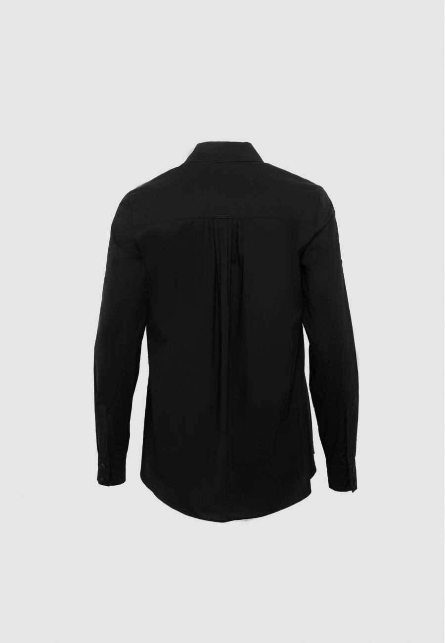 Блузка женская, прямого силуэта, умеренной длины, с выгнутым слегка низом изделия по переду и спинке. Рукав втачной, длинный, с притачной манжетой на петли - пуговицы. Воротник отрезной на стойке. Полка декорирована вышивкой. Центральная часть спинки со сборкой у кокетки. Застежка центральная на петли и пуговицы.
