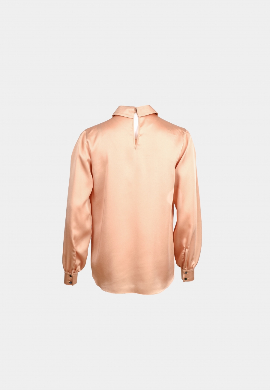 Блузка выполнена из струящейся ткани полиэстер. Воротник отложной на стойке. Застёжка сзади на петли и пуговицы. Перед блузки оформлен V-образным вырезом со складками от воротника. Рукав втачной, длинный, на приточной манжете на две петли и пуговицы.