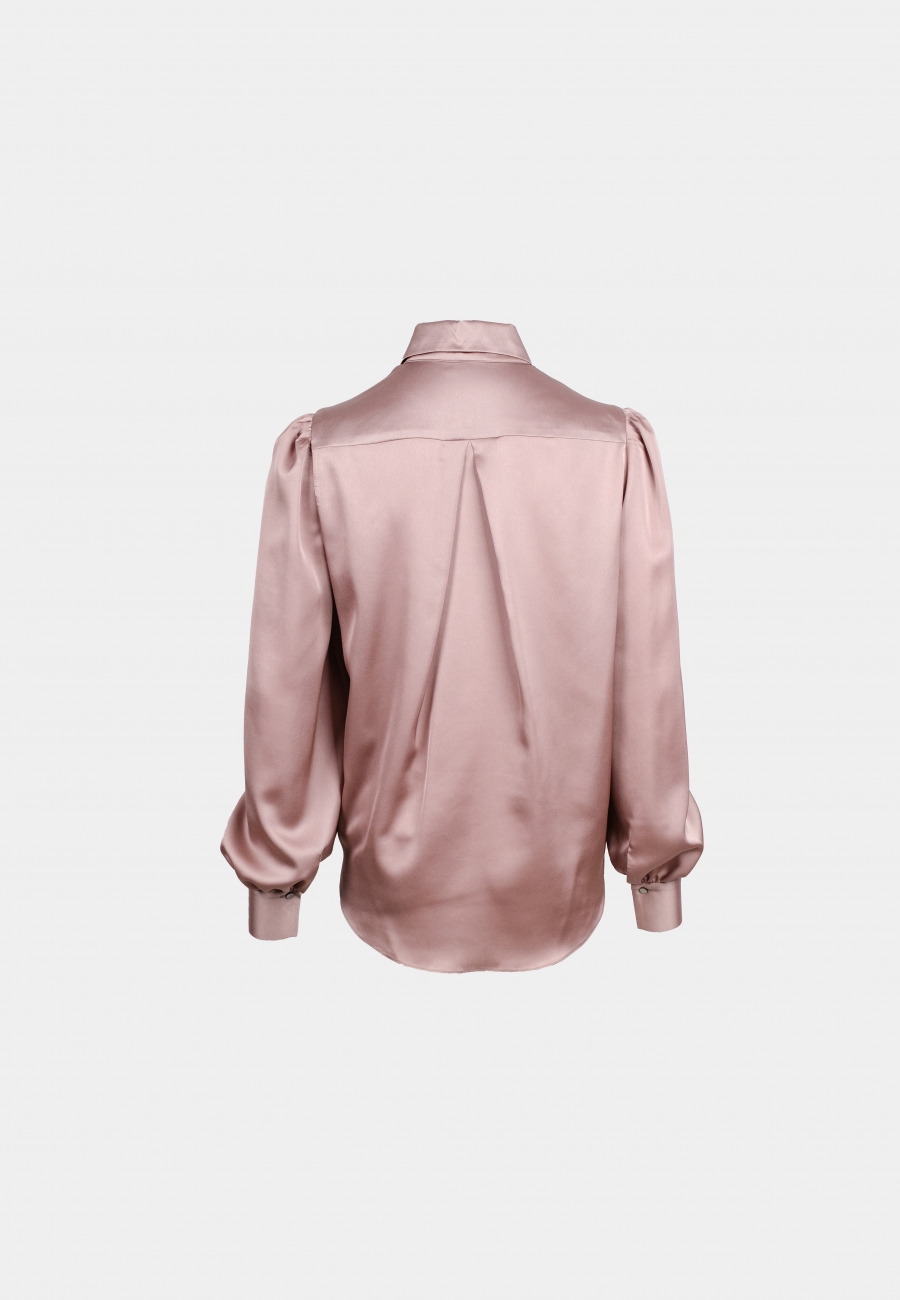 Блузка выполнена из струящейся ткани полиэстер, с втачным длинным рукавом на притачной манжете на петли и пуговицы. Горловина оформлена рубашечным воротником на стойке. Книзу рубашка завязывается на бант. Застёжка спереди изделия на потайной планке.