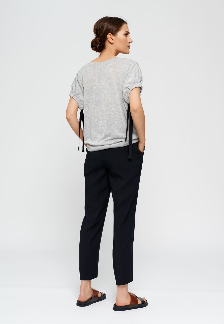 Брюки женские, на подкройном поясе с резинкой и декоративным шнурком. По переду прорезные карманы с листочками, по задней половинке декоративные листочки. Брюки без застежки.