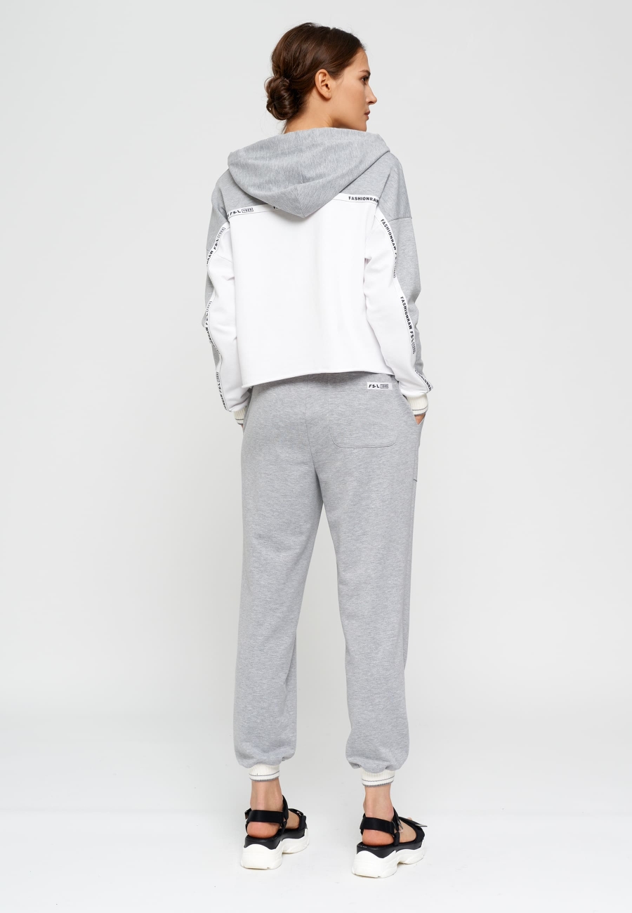 Брюки на подкройном поясе с резинкой и декоративным шнурком, втянутым в люверсы. По низу брюк вязаные манжеты. По передней половинке брюк накладные карманы фигурной формы. По задней половинке брюк накладной карман, закругленной формы.