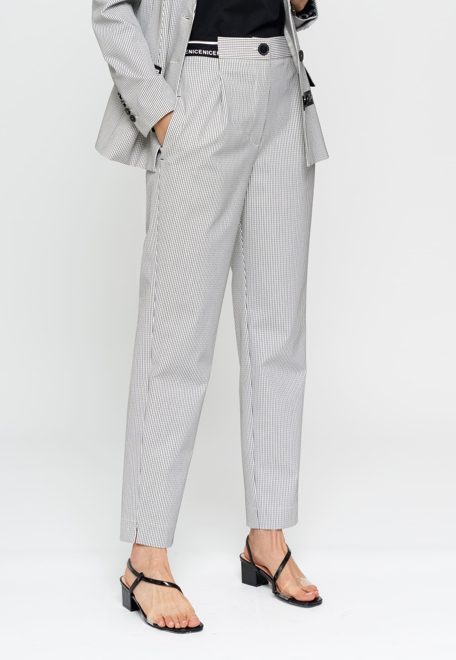 Брюки длинные, заужены книзу. Пояс отрезной с декоративной резиновой тесьмой. Внутренние карманы в боковых швах. Впереди от пояса заложены складки. Застежка на тесьму-молнию в гульфик и на петлю и пуговицу на поясе.
