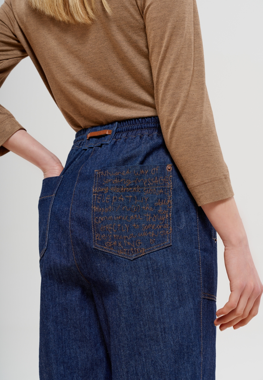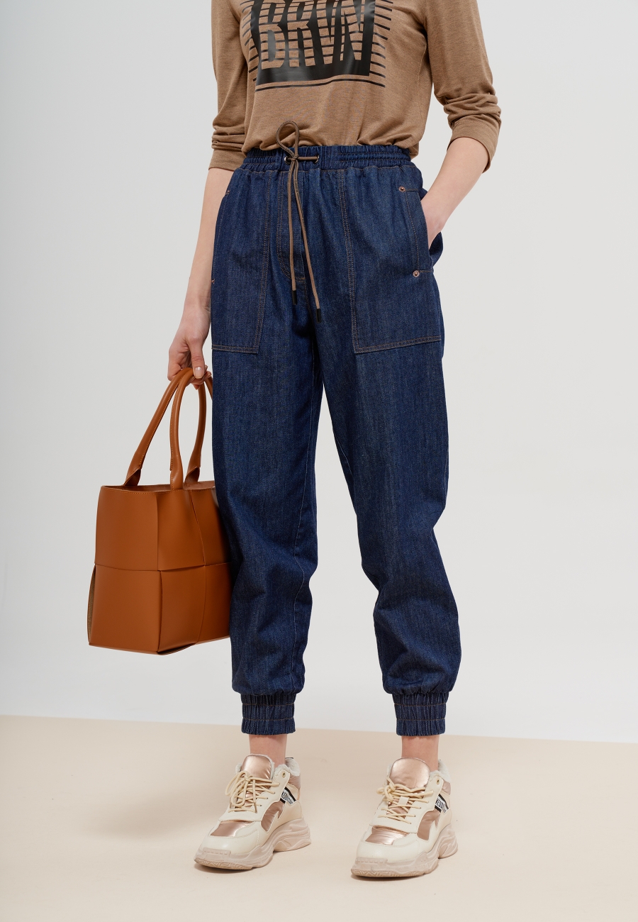Брюки женские в спортивном стиле. Пояс брюк на резинке с завязывающимся на талии декоративным шнурком. По низу брюк притачные манжеты на резинке. Спереди карманы в листочку, по спинке накладные карманы фигурной формы. Брюки без застежки.