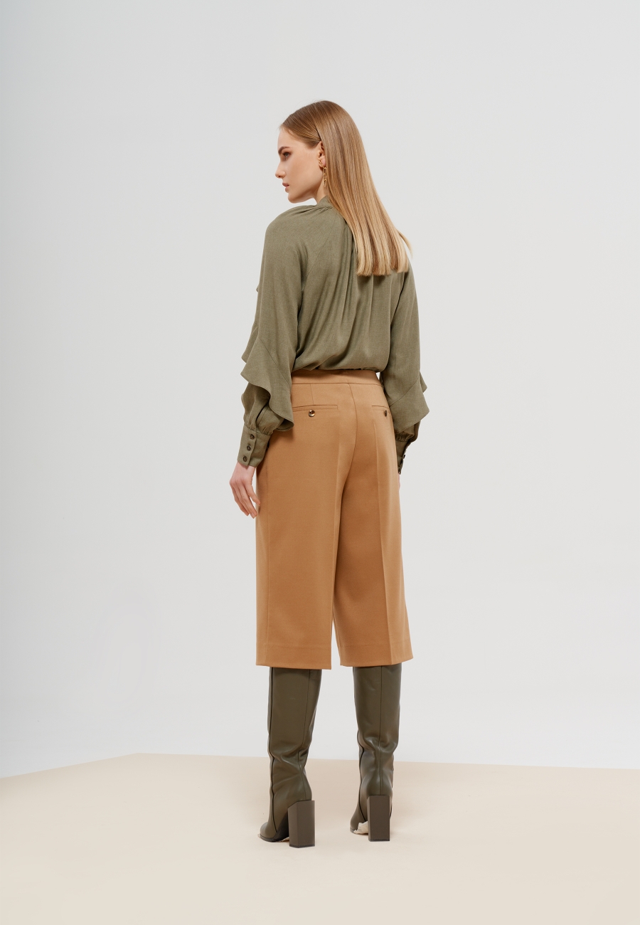Брюки женские капри, длиной чуть ниже колен, на притачном поясе, с застежкой на крючок потайной на поясе и тесьму-молнию в гульфик. Сзади и впереди заутюжены канты. Декоративные рамки-обманки с пуговицами расположены сзади. Внутренние карманы в боковых швах.