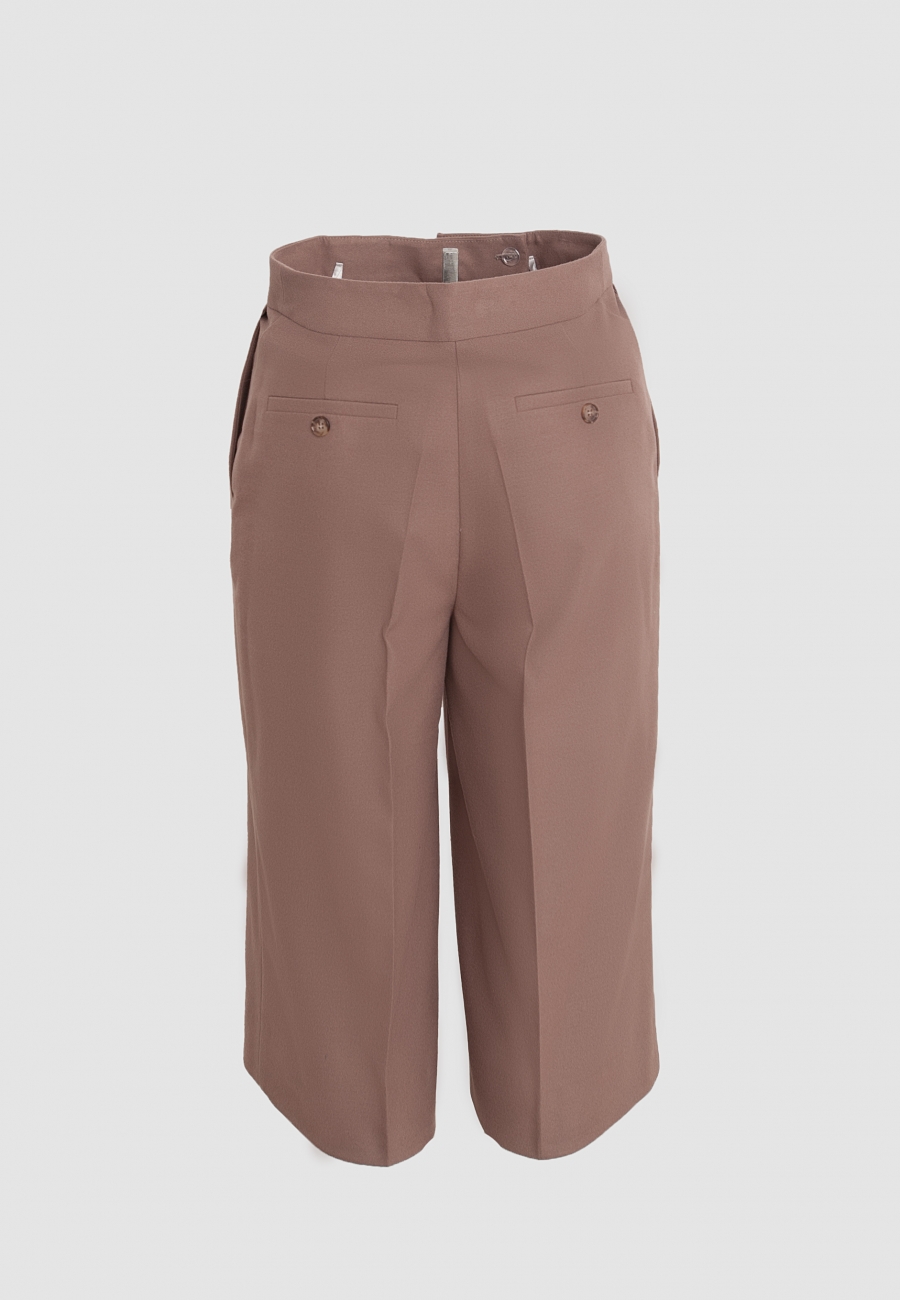 Брюки женские капри, длиной чуть ниже колен, на притачном поясе, с застежкой на крючок потайной на поясе и тесьму-молнию в гульфик. Сзади и впереди заутюжены канты. Декоративные рамки-обманки с пуговицами расположены сзади. Внутренние карманы в боковых швах.