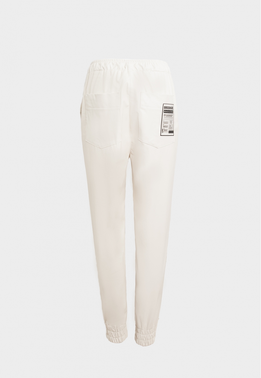 Брюки женские, прямые, вверху на резинке и шнурком, втянутым в блочки. По передней половинке брюк прорезные карманы и вертикальные швы. По задней половинке накладные карманы. Внизу брюк притачные манжеты на резинке.