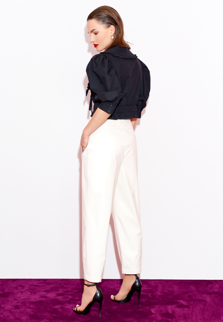 Брюки женские, длиной 7/8, на широком подкрайном поясе, со складками по передней половинке брюк. Внизу брюк небольшие вытачки. По передней половинке брюк карманы с листочками, по задней - декоративные листочки. Застежка на молнию и петлю с пуговицей по поясу.