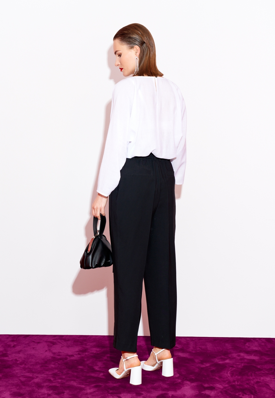 Брюки женские, на притачном поясе, со складками от пояса и шлевками. Наклонные боковые карманы, карманы с листочками на задних половинках брюк. На поясе по спинке резинка. Мягкий пояс из основной ткани.
