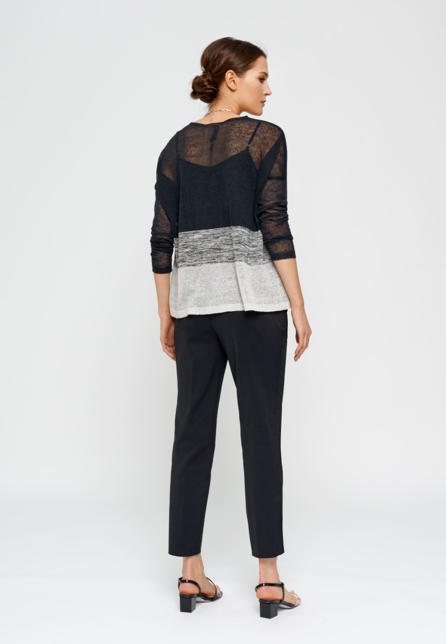 Джемпер вязаный, свободный, умеренной длины с длинным рукавом. V-образный вырез горловины. Спущенное плечо. Пришивной декор.