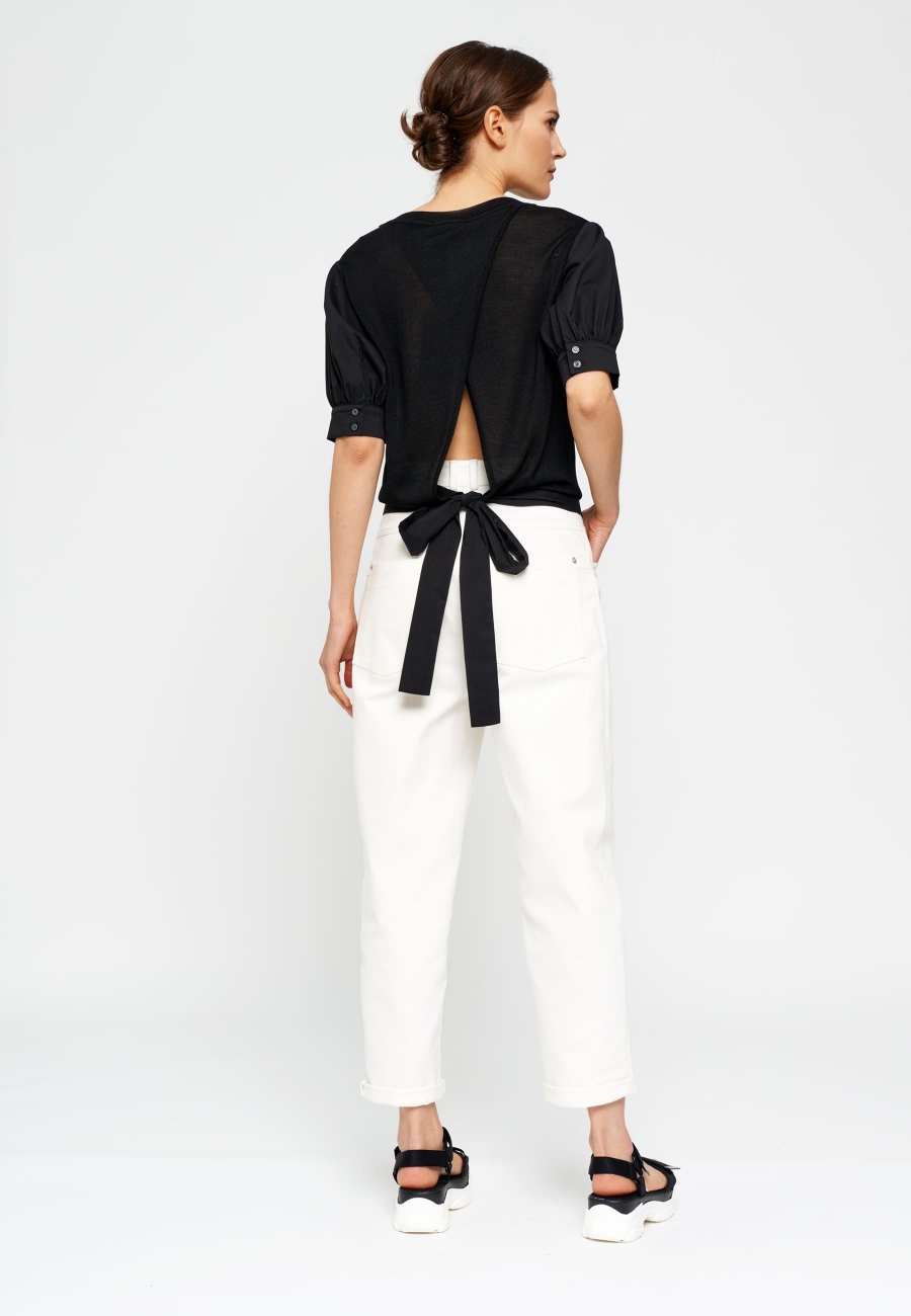Джемпер женский, полуприлегающего силуэта, с короткими втачными рукавами. Горловина джемпера формой-лодочка. По спинке идет запах от линии горловины и внизу завязывается на бант. По низу рукавов широкие манжеты, застегивающиеся на петли и пуговицы, и мелкие складочки, идущие от манжет. Рукава и притачная деталь низа, переходящая в бант, из отделочной ткани.