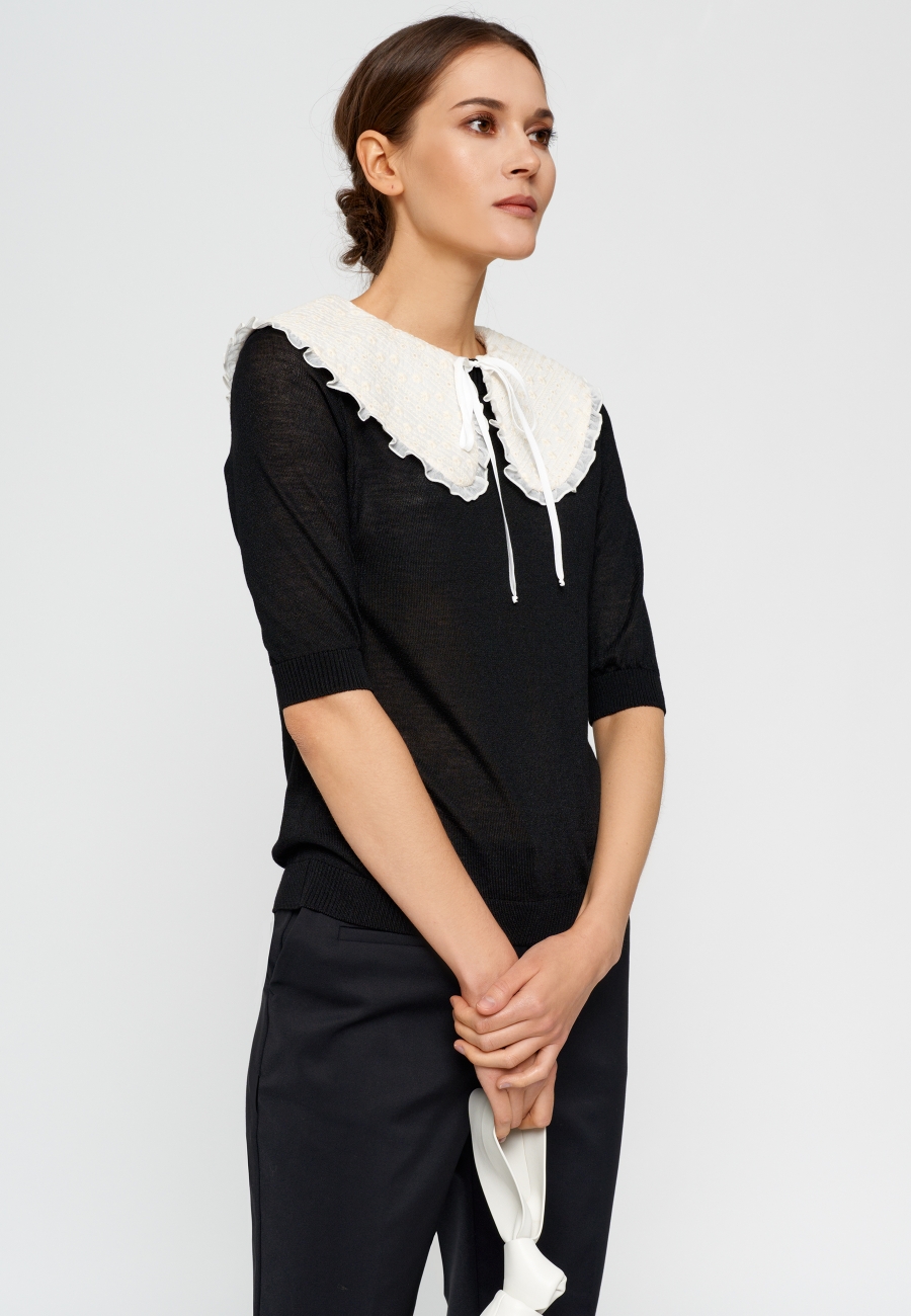 Джемпер короткий, полуприлегающего силуэта, с короткими втачными рукавами и головиной круглой формы. Дополнительно к джемперу идет съемный воротник, закругленной формы, крепящийся к джемперу на петли и пуговицы.