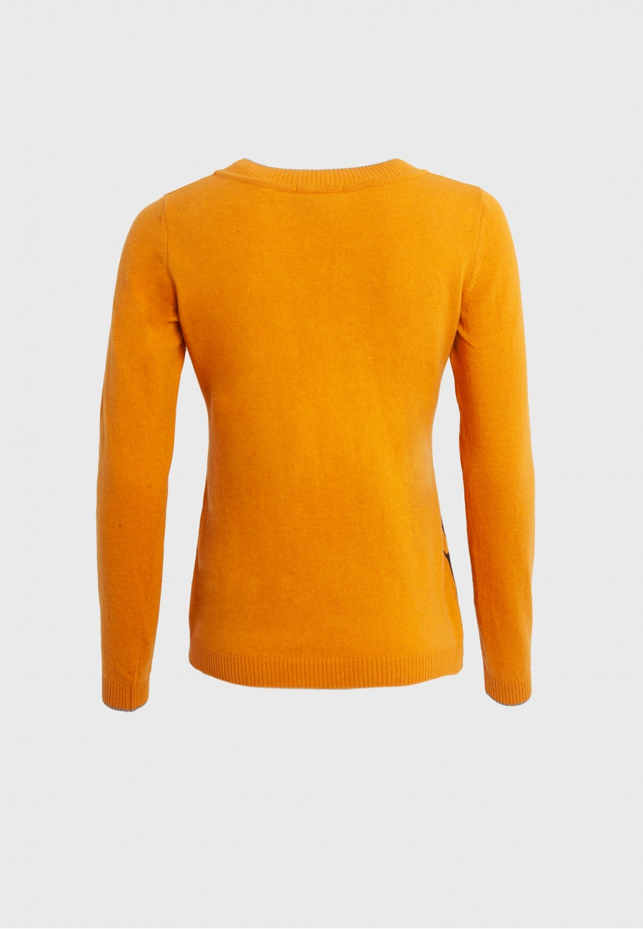 Джемпер женский, полуприлегающего силуэта, с длинными втачными рукавами и круглым вырезом горловины. По переду джемпера - декоративная печать. Джемпер без застежки.