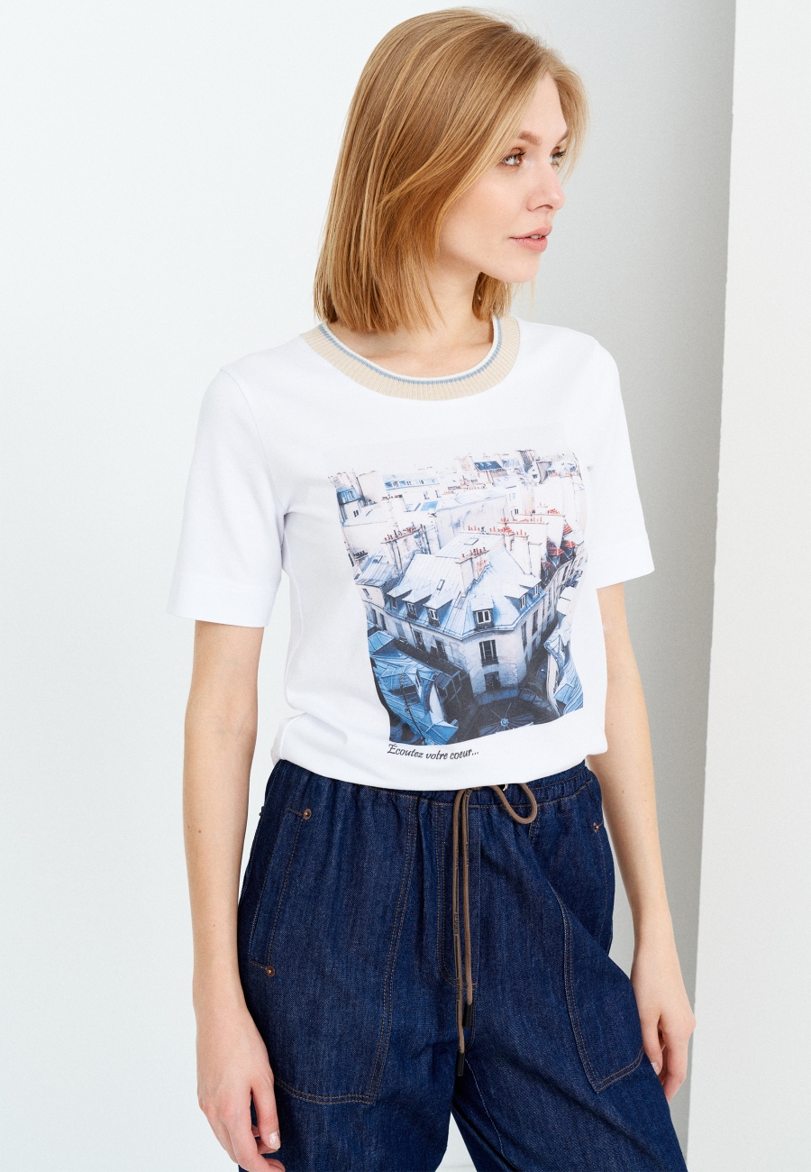 Джемпер женский полуприлегающего силуэта, с короткими втачными рукавами. Горловина круглой формы, обработана вязаной резинкой. Джемпер без застежки.