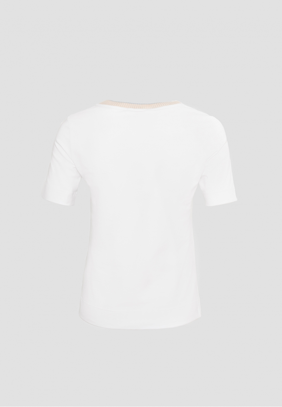 Джемпер женский полуприлегающего силуэта, с короткими втачными рукавами. Горловина круглой формы, обработана вязаной резинкой. Джемпер без застежки.