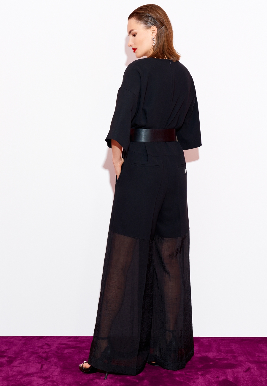 Комбинезон женский, прямого силуэта, с длинными брюками и горизонтальным подрезом ниже линии талии. По передней части брюк карманы с листочками, по задней части декоративные листочки. Рукава короткие, линия проймы спущенная. Горловины V-образной формы. Застежка на тесьму-молнию по спинке.
