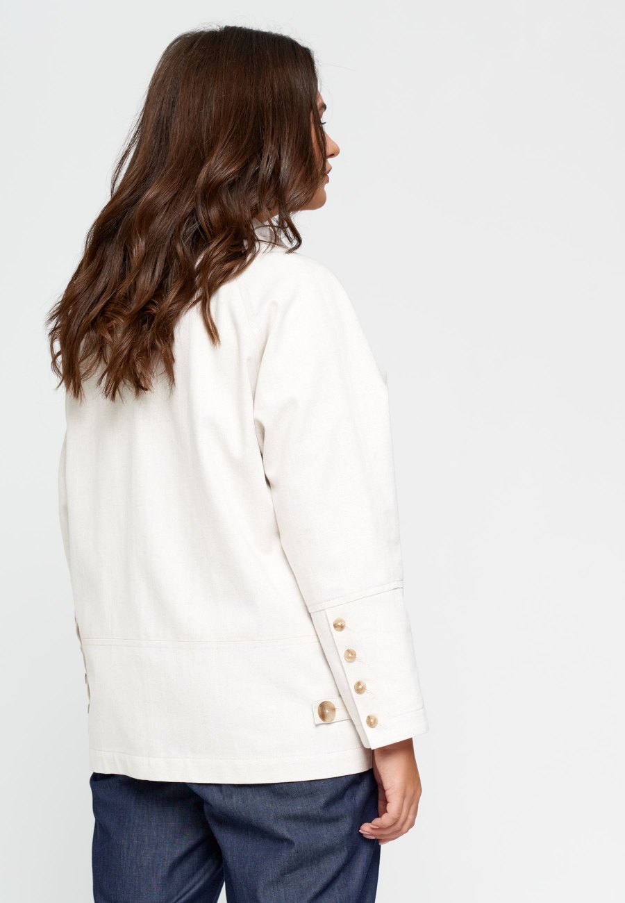 Куртка женская, свободного кроя, со спущенным плечом. Длинный рукав заканчивается широкой отрезной манжетой и застегивается на петли и пуговицы. Накладные карманы на полке. В подрезах на полке тоже внутренние карманы. Декоративные хлястики с пуговицей в боковых швах на спинке. Застежка на петли и пуговицы впереди.