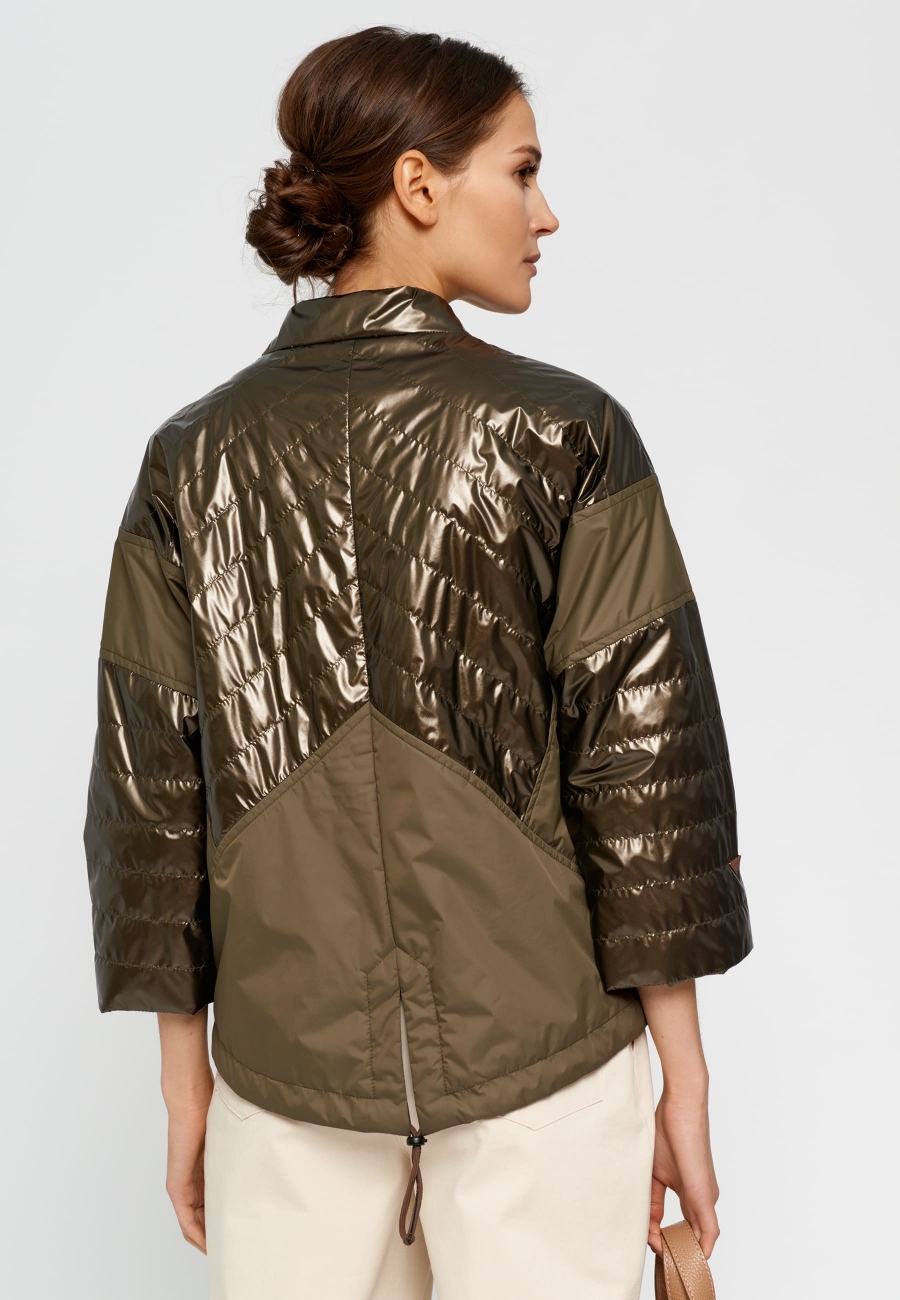 Куртка женская, короткая, с воротником-стойкой, объемная, со спущенными рукавами длиной 3/4. По переду и спинке фигурные подрезы. Центральная часть переда, спинки и рукава на стежке. Линия низа куртки асимметричной формы. Центральная застежка на кнопки по планке.