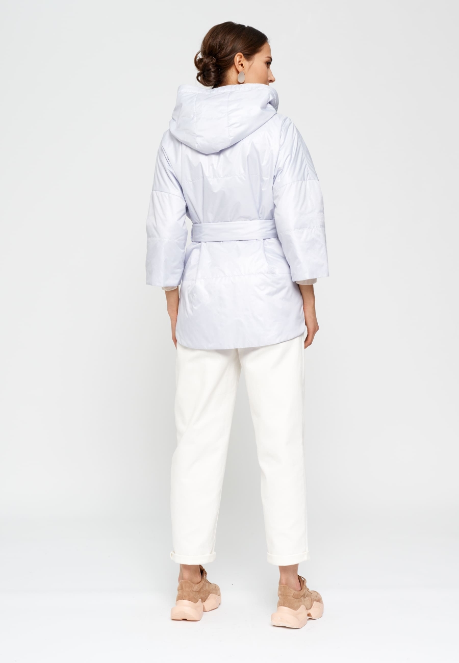 Куртка женская, прямого силуэта, с центральной застежкой на молнию и потайные кнопки. Рукава спущенные 3/4. Капюшон с блочками и шнуром. Карманы прорезные в рамку. Пояс съемный с пряжкой, шлевки в боковых швах. Фигурный низ изделия.