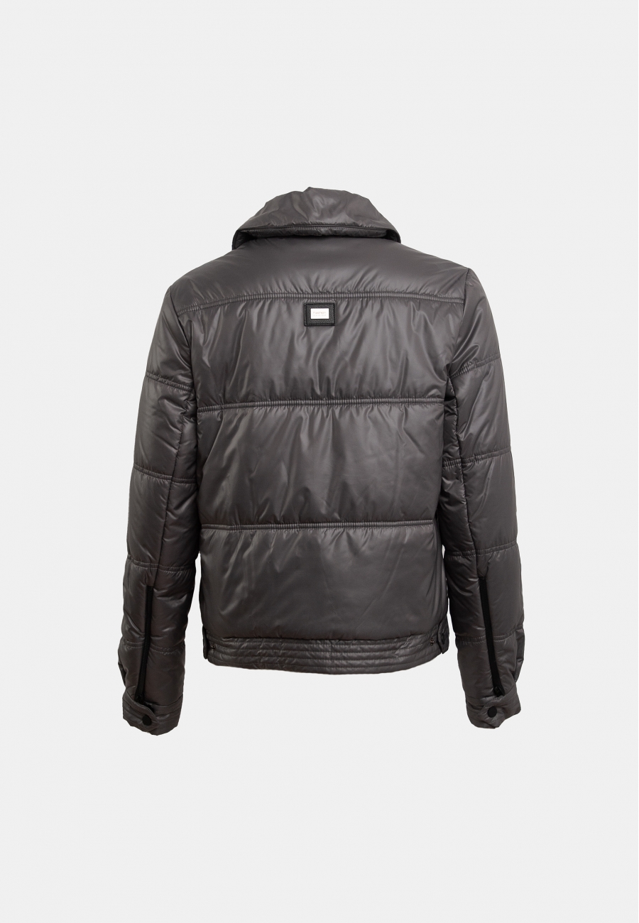 Куртка женская, короткая, объемная, с втачными рукавами. Рукава длинные, втачные, с манжетой по низу, застегивающейся на кнопку. По локтевому шву от линии притачивания - манжеты-молния. Воротник стояче-отложной. Застежка куртки смещенная на молнию. Карманы прорезные с молниями по переду изделия. По низу куртки притачная планка, застегивающаяся на кнопку.
