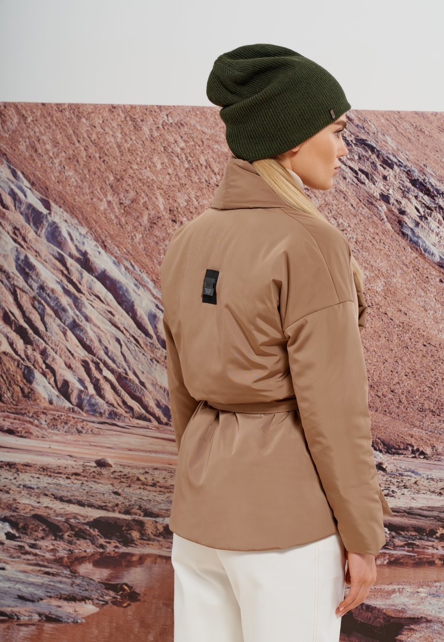 Куртка женская, утепленная, длиной до линии бедер. Карманы в рельефных швах, воротник стойка с отворотом, спущенная линия проймы. Куртка на запах, потайная завязка с изнанки изделия. Пояс мягкий из основной ткани.