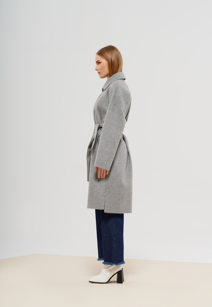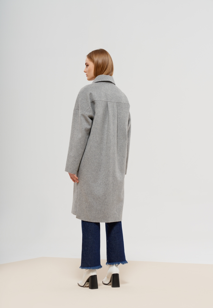 Пальто женское oversize длиной выше линии колен. Рукава прямые спущенные, воротник отложной с прямыми концами, потайная застежка на кнопки. Мягкий пояс с отделочной тесьмой. Прорезные карманы с листочками по переду, спинка с отрезной кокеткой и складками от кокетки. Разрезы по боковым швам. Спинка удлинена относительно переда.