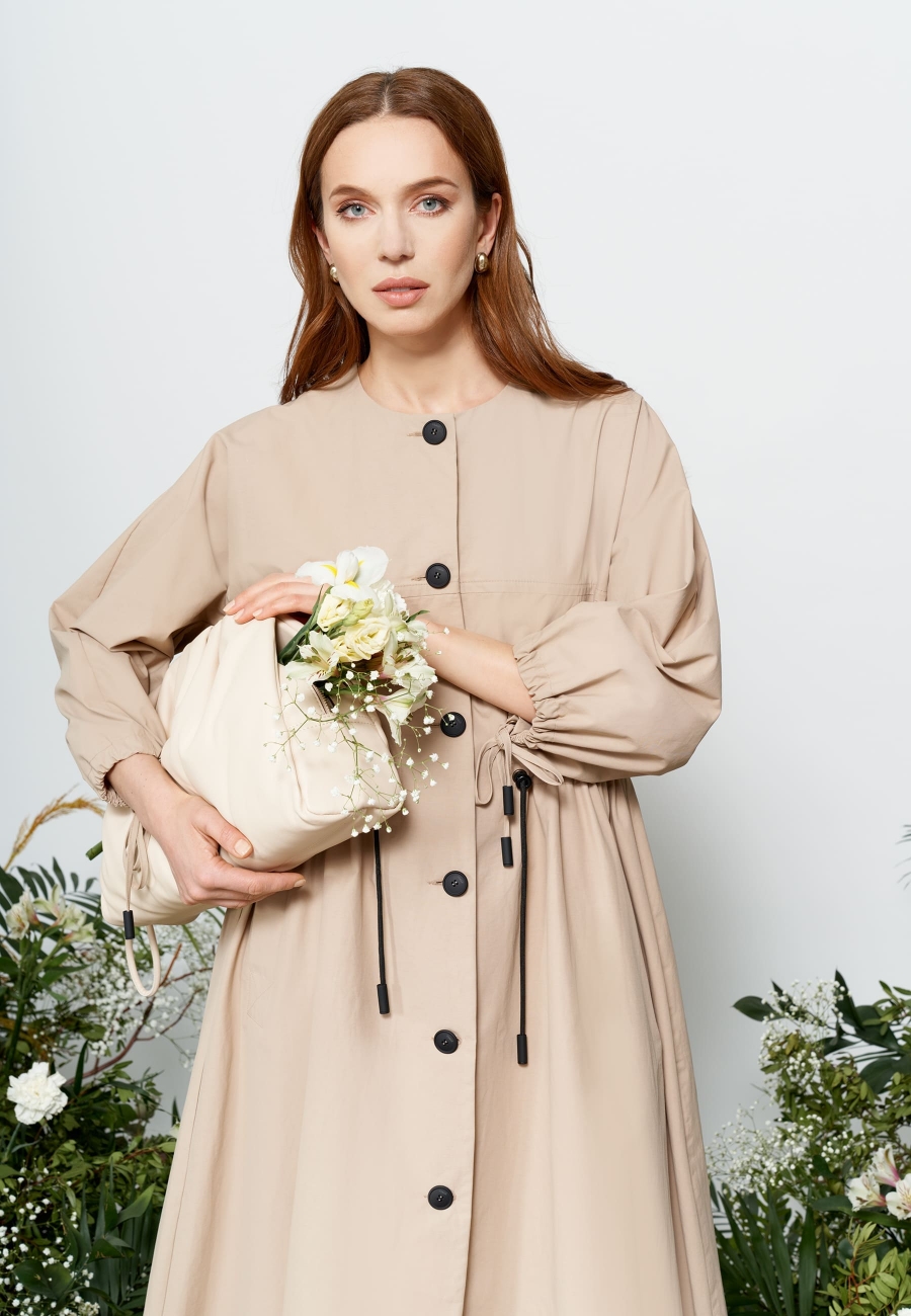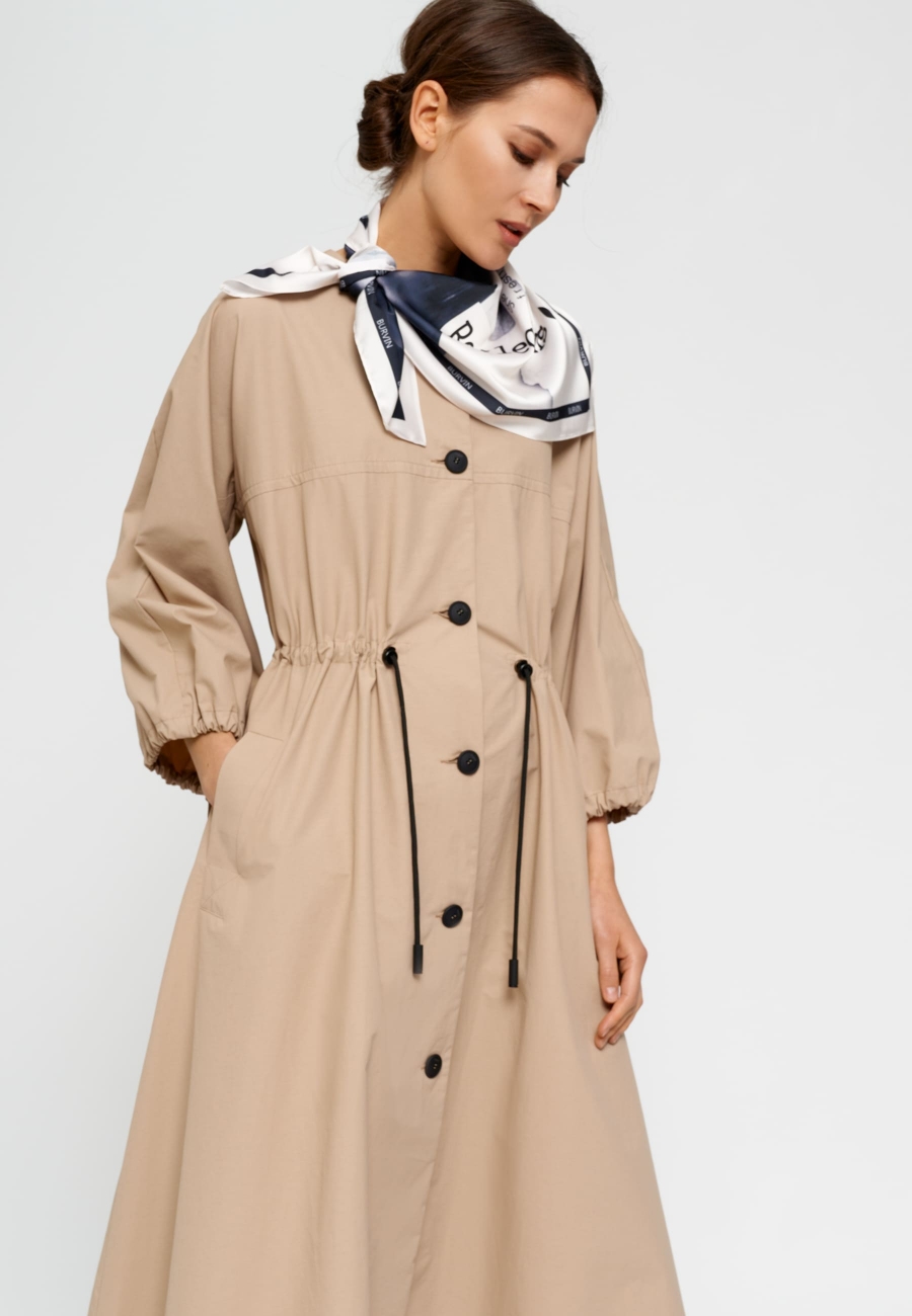 Плащ женский, длинный, трапециевидного силуэта, с круглым вырезом горловины и цельнокроеными, расширенными книзу рукавами. По переду и спинке плаща горизонтальный подрез по линии груди. Прорезные карманы с листочкой по переду и кулисой с декоративным шнуром по спинке и переду. По низу рукава кулиса со шнуром, что позволяет регулировать ширину рукава. Застежка центральная на петли и пуговицы.