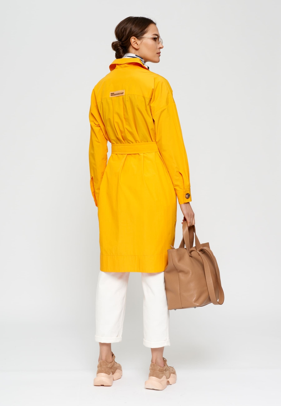 Плащ женский длиной до середины колен с центральной застежкой на петли и пуговицы. По переду кокетки, накладные карманы с клапанами и боковые наклонные карманы с клапанами. Спинка с кокеткой и складкой от кокетки. Рукава рубашечного кроя с манжетами. Стояче-отложной воротник. Пояс из основной ткани с пряжкой.