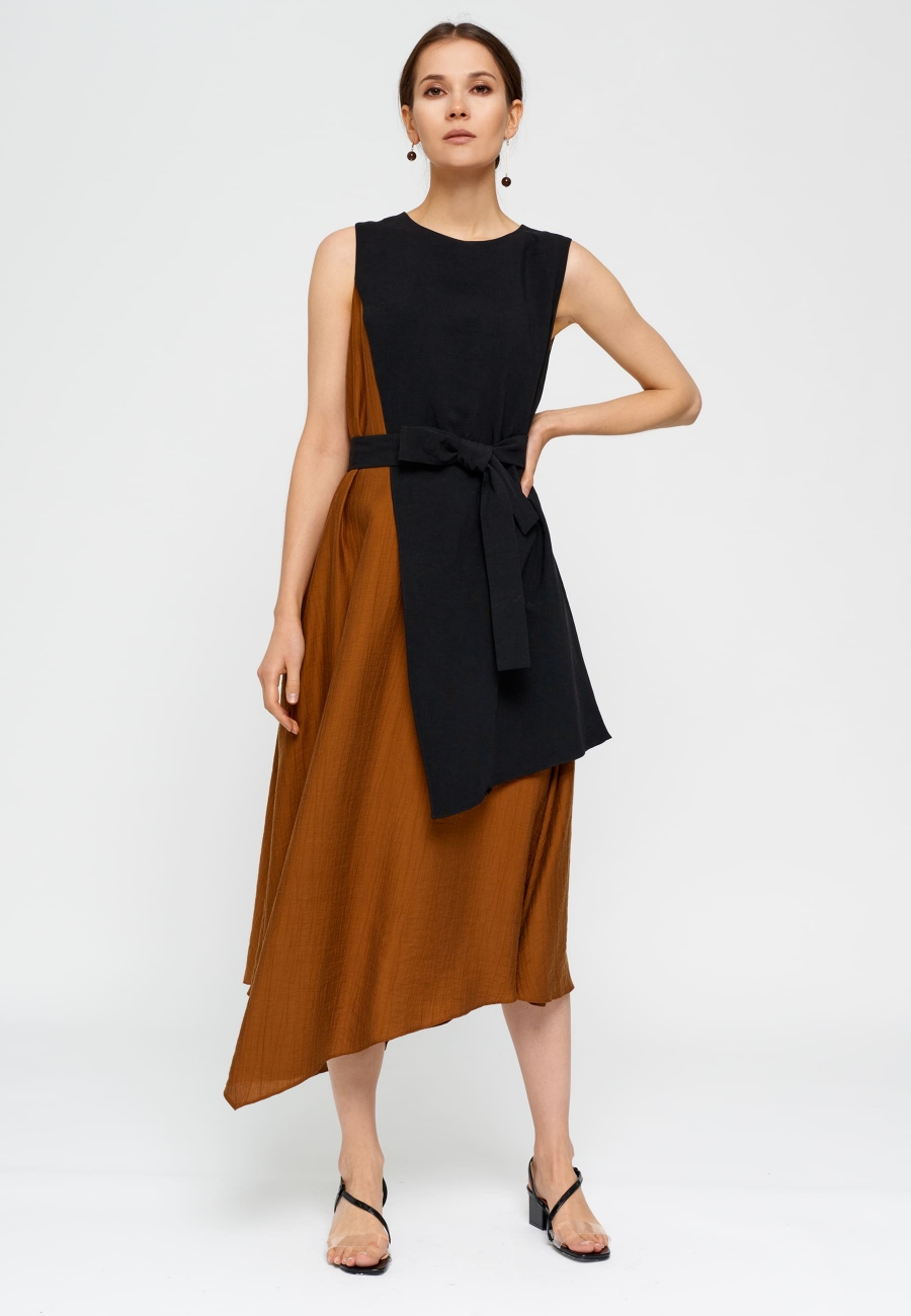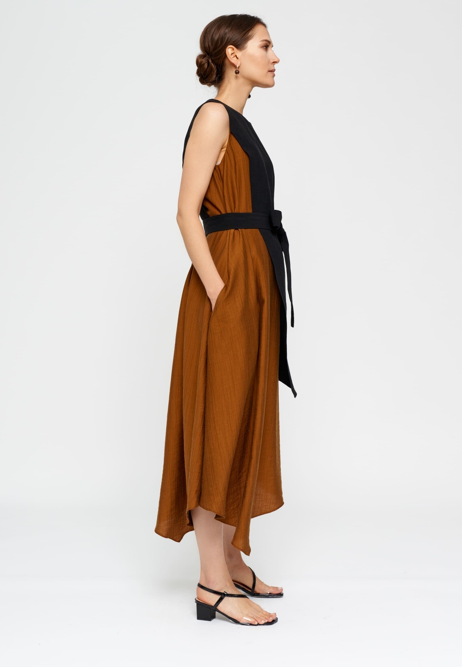 Платье женское, А-силуэта, длинное, с отлетной декоративной деталью по переду и спинке, втачной в плечевые швы и пройму. Ассиметричный низ. Застежка на навесную петлю и пуговицу. Изделие со съемным поясом.