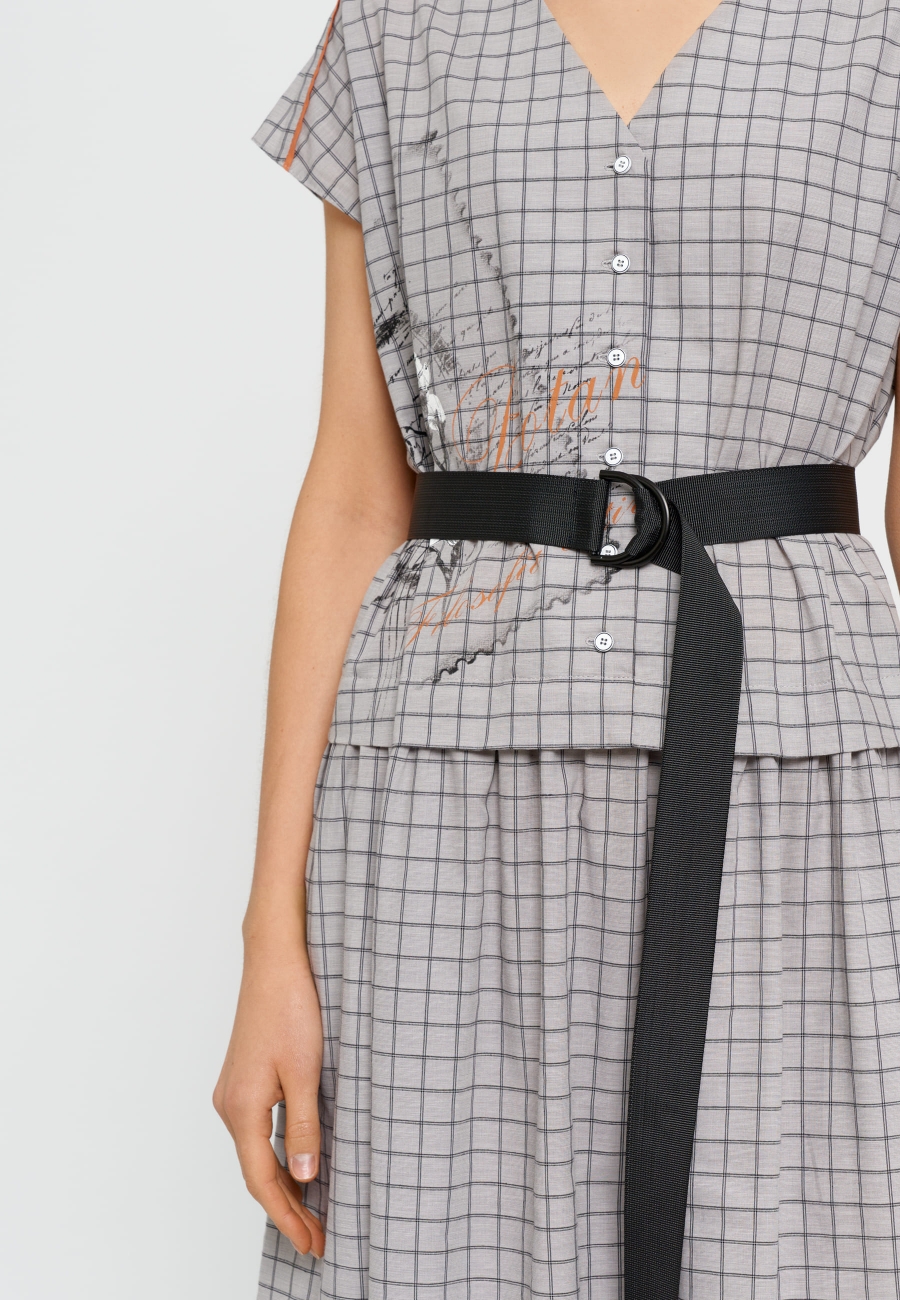 Платье женское, длинное, со спущенным плечом, отрезное по линии ниже талии. По подрезу сборка в юбке расширяет платье книзу. В боковых швах внутренние карманы выполнены от подреза вниз. Отрезная кокетка переходит со спинки на перед, выделена кантами яркого цвета. V-образный вырез горловины. Застежка на петли-пуговицы до подреза. Лиф платья с печатью. Съёмный пояс в комплекте.