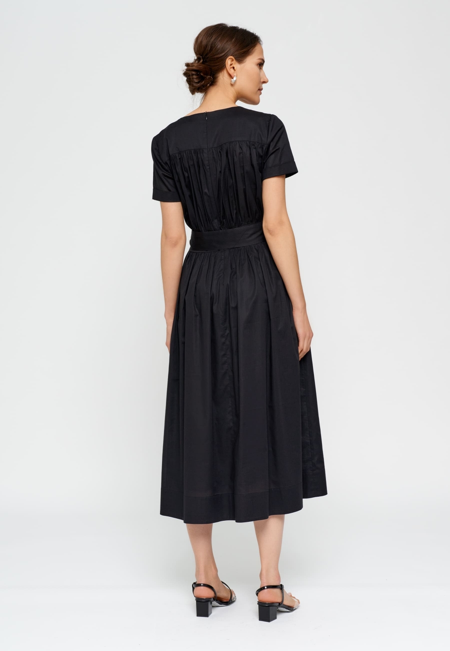 Платье женское, прилегающего силуэта, с короткими втачными рукавами с манжетами и длиной ниже линии колен. Платье подрезное по линии талии. Юбка платья расширена книзу, со сборкой от линии подреза. По переду и спинке платья кокетки и сборка, идущая от линии кокеток. Перед платья с асимметричным запахом. Застежка на тесьму-молнию по спинке в среднем шве. Платье со съемным поясом из основной ткани.