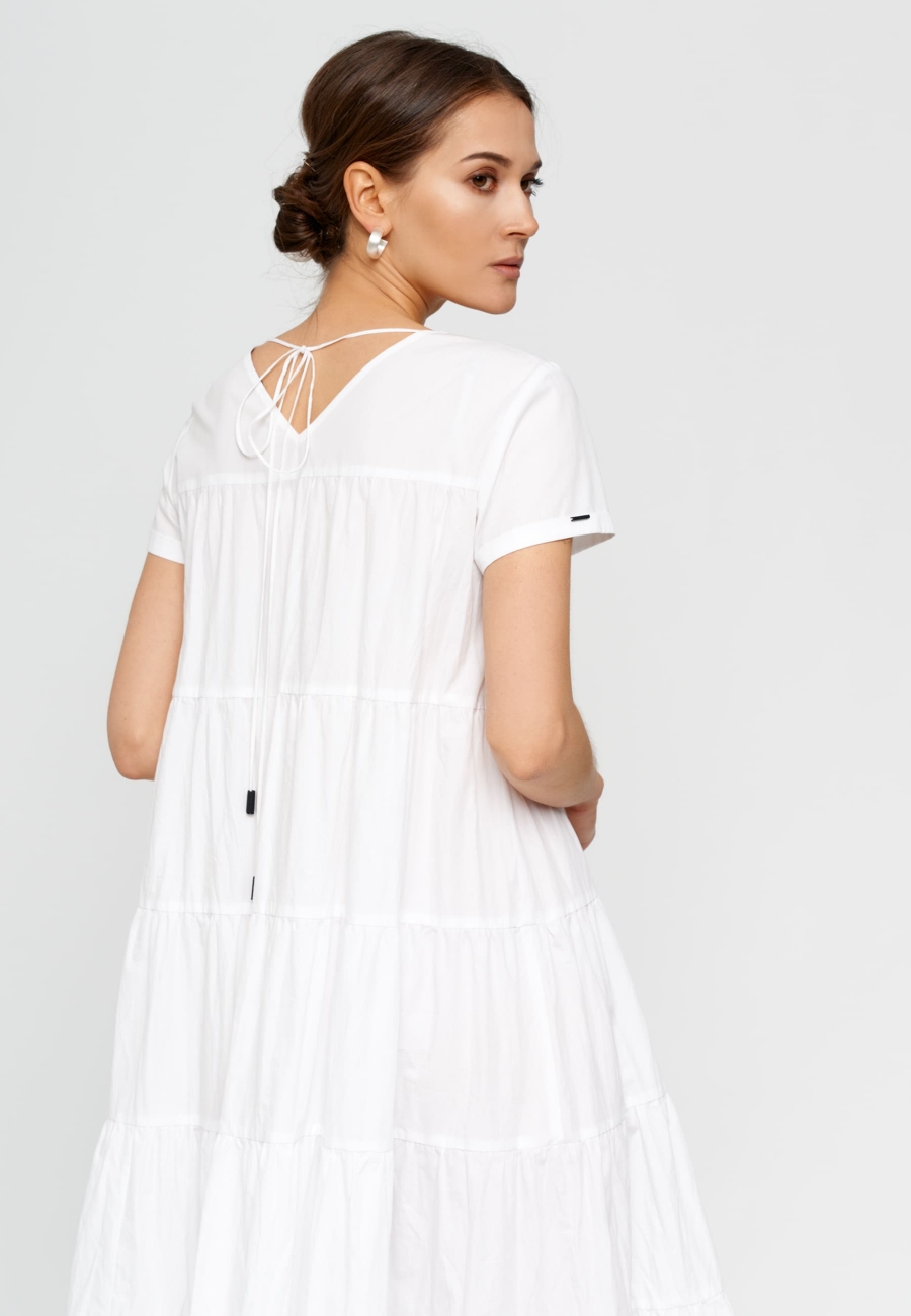 Платье женское, трапециевидного силуэта, расширенное книзу, длиной ниже линии колен, с короткими втачными рукавами с манжетами. По переду и спинке платья горизонтальные подрезы и сборка, идущая от подрезов. Горловина V-образной формы. Платье без застежки, завязывается на шнурок по горловине спинки.