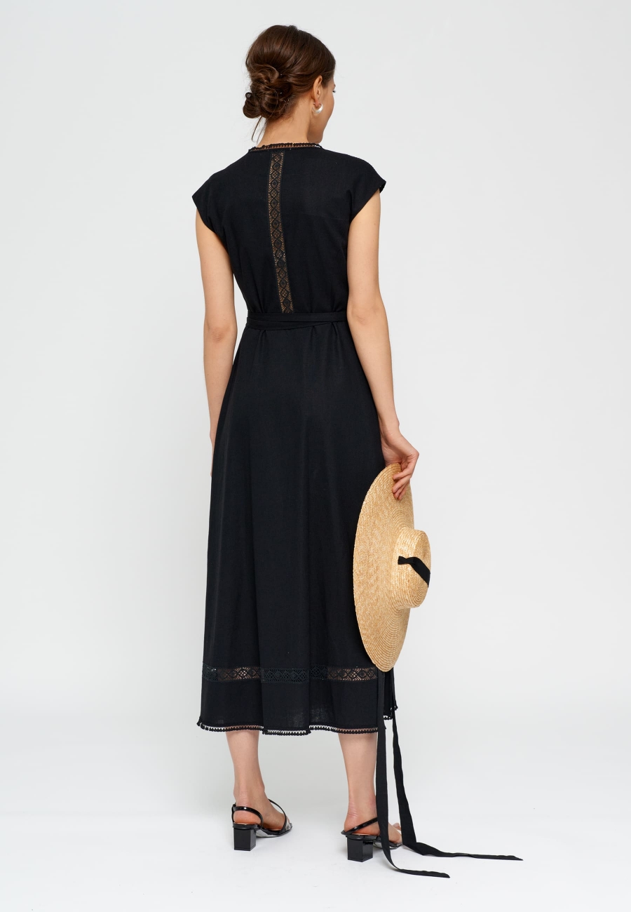 Платье женское, на запах, длиной ниже линии колен, расширенное книзу, со спущенной линией проймы. По линии талии подрез. По переду платья прорезные карманы с листочками. Платье декорировано кружевом.