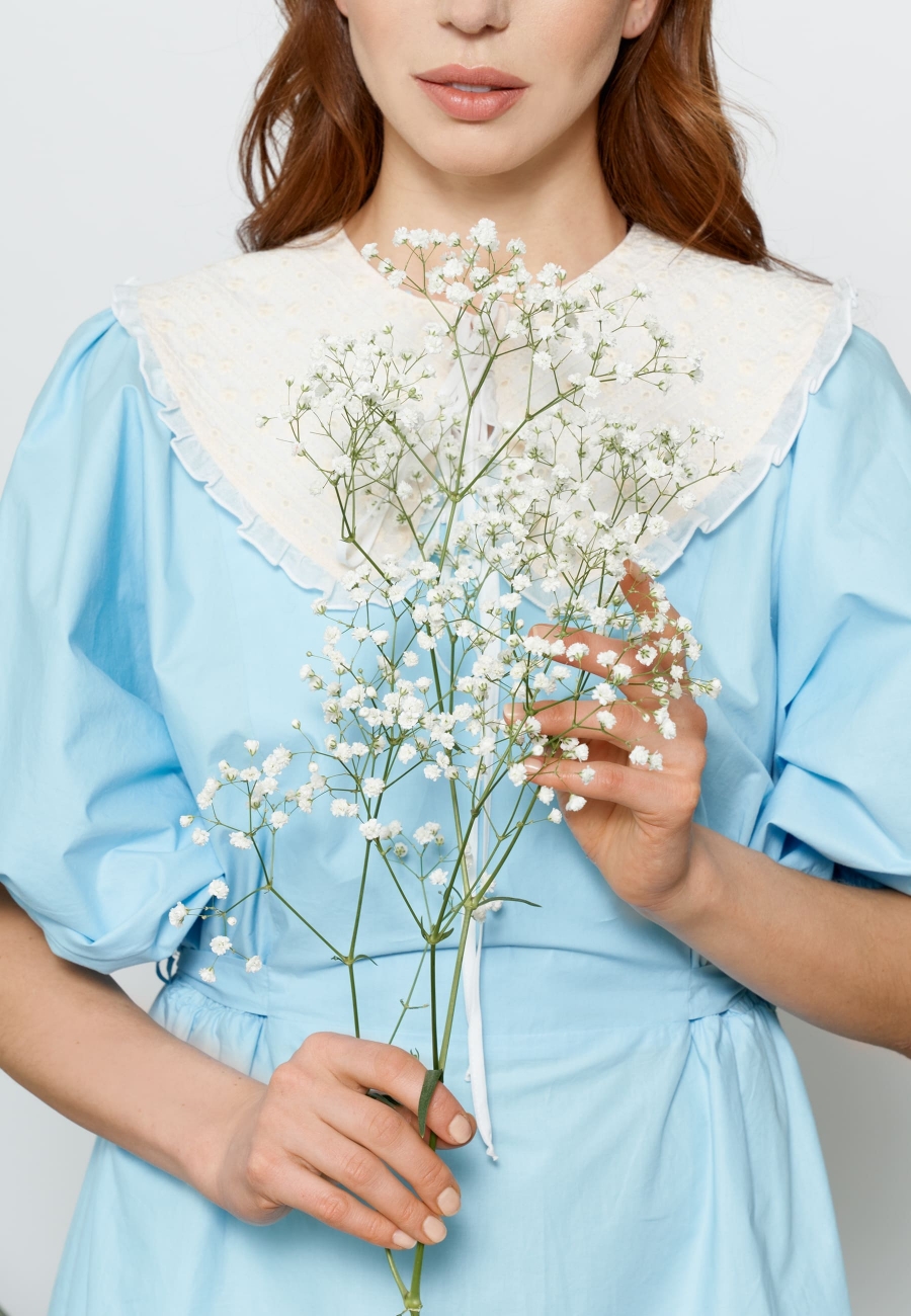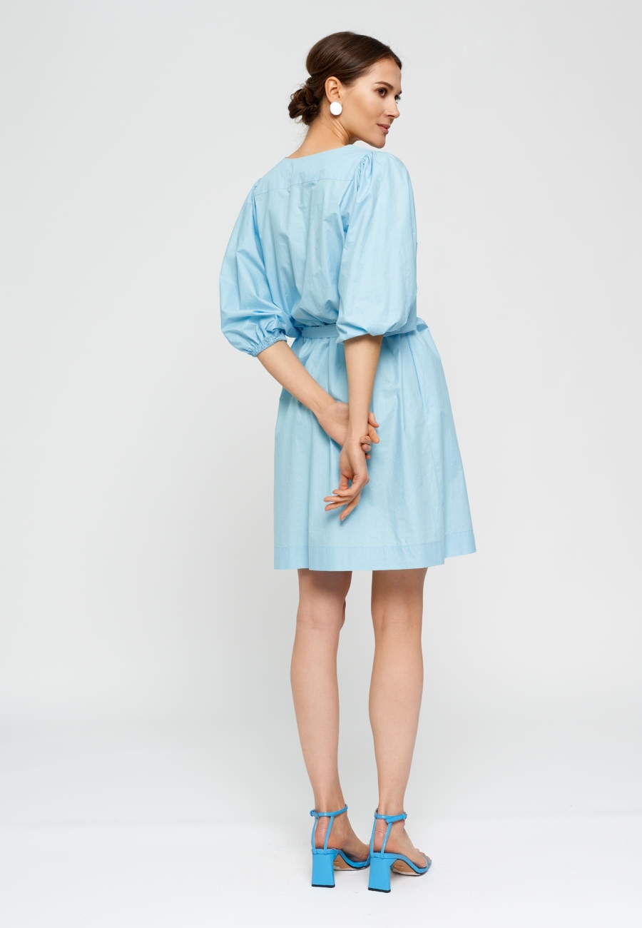 Платье женское, отрезное по линии талии, длиной выше линии колен. Объемные цельнокроеные рукава 3/4, со сборкой на резинку по низу. Сборка на резинку по талии. Тонкие пояса, из основной ткани, из рельефов переда оборачиваются вокруг талии и завязываются на бант.