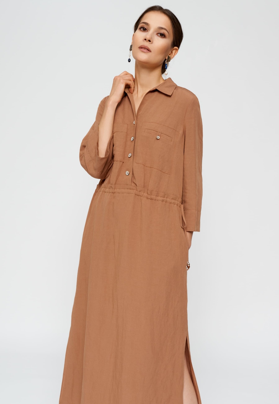 Платье женское, свободного покроя, чуть расширено книзу, длиной до щиколоток. Отрезное по талии с кулисой впереди и сзади. Правая полка с накладным карманом, левая - с внутренним карманом в рамку. Рукав 3/ 4 чуть расширен книзу. Застежка впереди до подреза на петли и пуговицы. В боковых швах высокие разрезы.