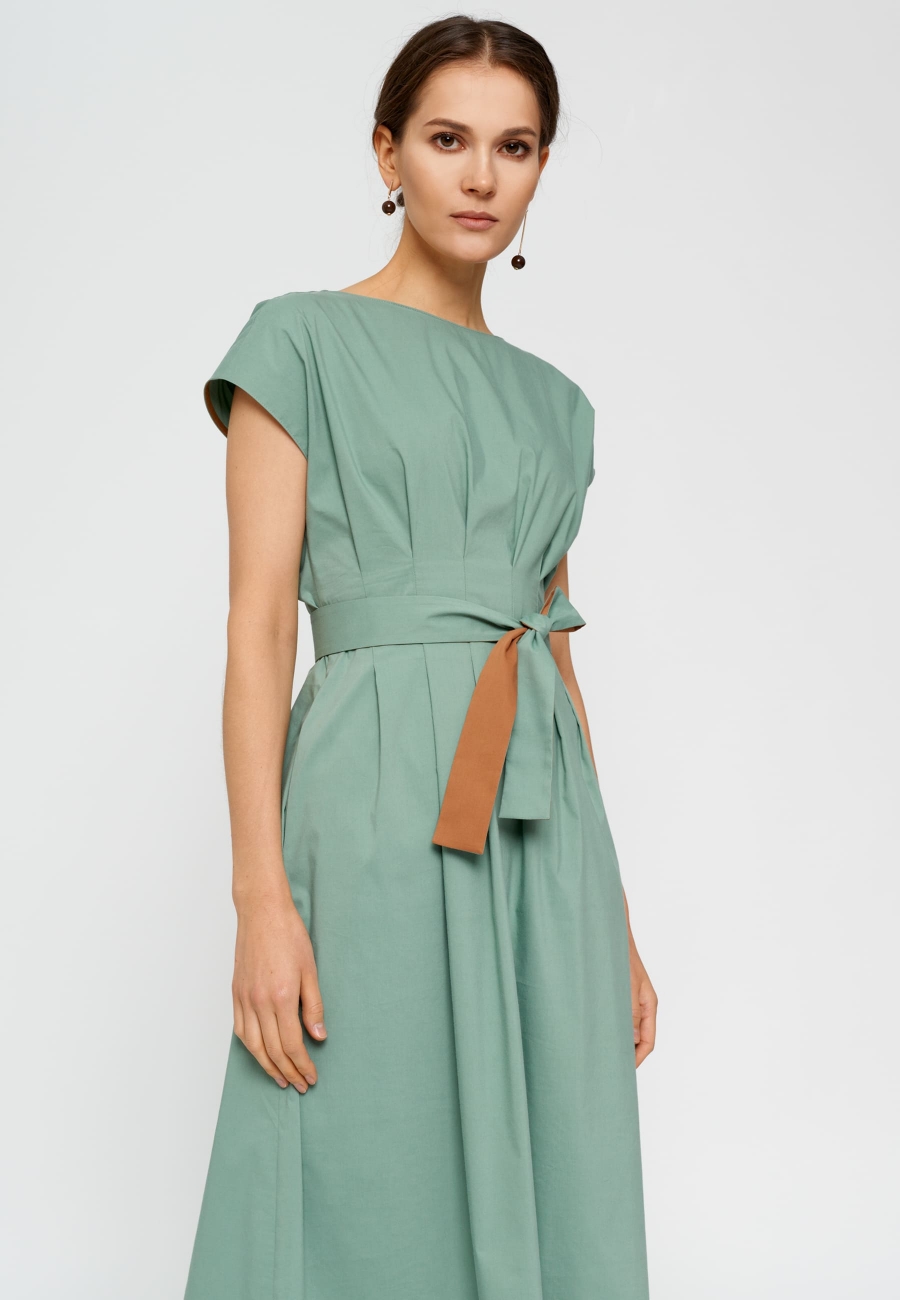 Платье женское, приталенного силуэта, длиной ниже колен. По талии застрочены складки. Спущенная линия плеча. Сзади застежка в среднем шве на потайную молнию. Пояс съемный.