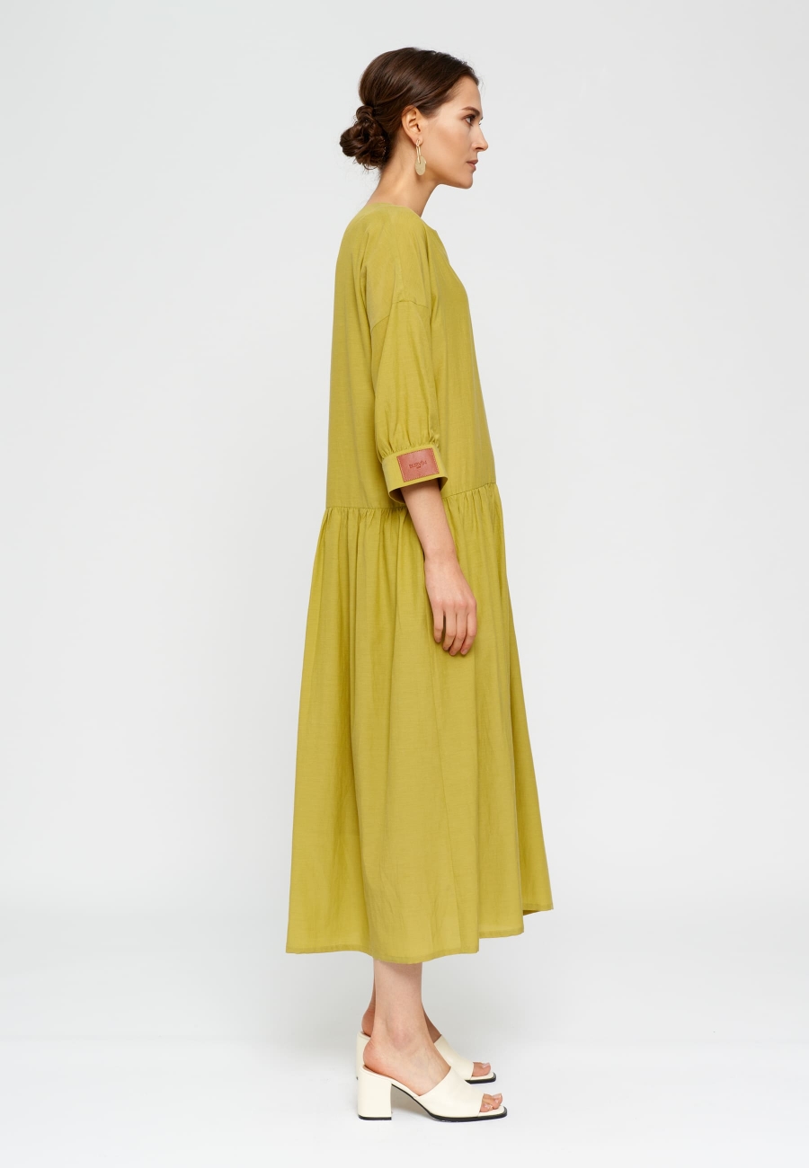 Платье женское, прямого кроя, длиной миди. Горизонтальный подрез выше линии бедер, сборка от подреза. Рукава спущенные 3/4 с манжетами и сборкой от манжет. Округлый вырез горловины с разрезом по переду обработан обтачкой. Карманы в швах.