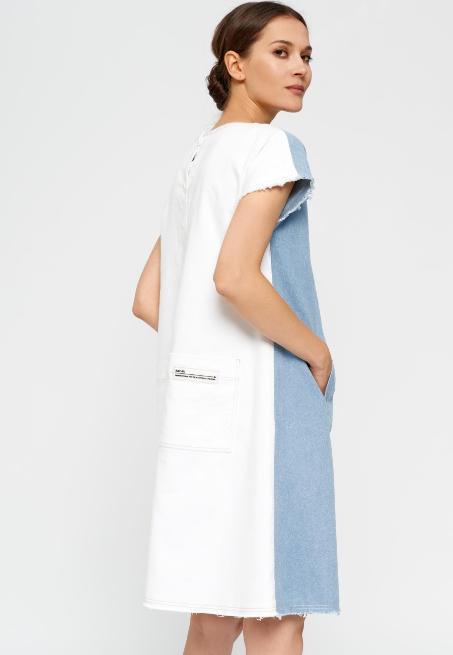 Платье женское, трапециевидного силуэта, расширенное книзу, длиной выше линии колен, со спущенной линией проймы. Горловины платья формой-лодочка. По переду платья прорезные карманы с листочкой, по спинке накладные карманы. Застежка по среднему шву спинки на петлю и пуговицу.