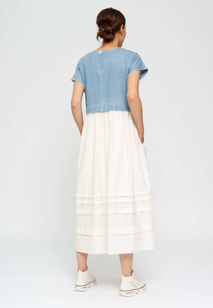 Платье женское, расширенное книзу, длиной ниже линии колен. По линии талии подрез по переду и спинке. Юбка платья со сборкой от линии подреза и складками разных размеров по низу юбки. Горловина платья V-образной формы, застежка по спинке на петлю и пуговицу.