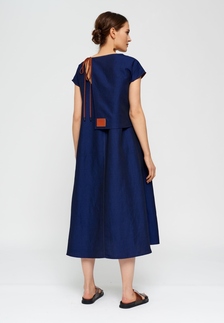 Платье женское, трапециевидного силуэта, расширенное книзу, со спущенной линией проймы, длиной ниже линии колен. Горловина формой-лодочка по переду, круглая, углубленная горловина по спинке. По спинке асимметричная деталь с завязкой по горловине. Платье со средними швами по спинке и по переду, без застежки.