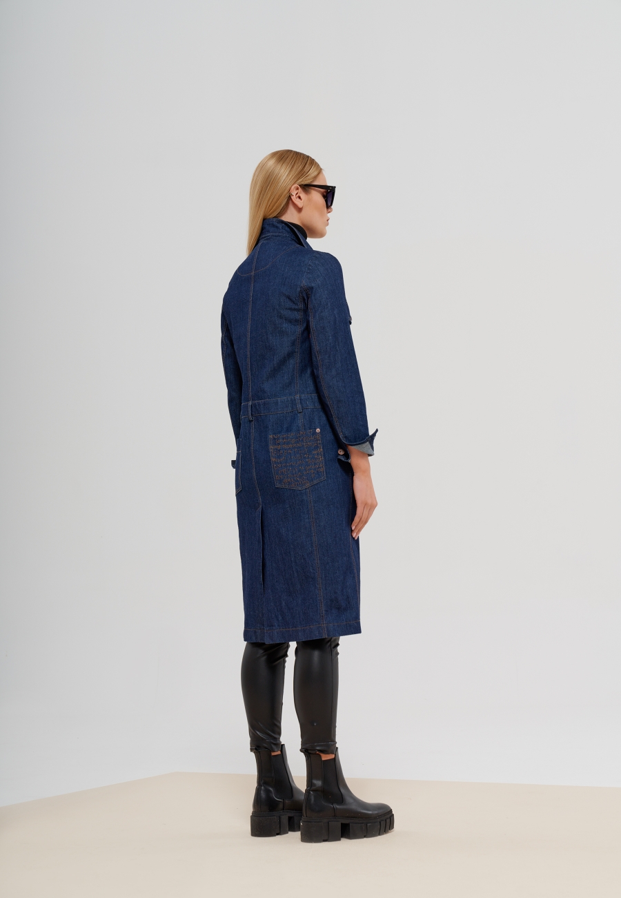 Платье женское, полуприлегающего силуэта, длиной ниже линии колен, со стояче-отложным воротником и втачными рукавами. По переду платья на лифе - кокетка, фигурные членения и клапаны, идущие от линии кокетки. Ниже линии талии - горизонтальные подрезы, по переду и спинке, имитирующие пояс со шлевками. Спереди, карманы прорезные фигурной формы, идущие от горизонтальной линии подреза. По спинке - накладные карманы фигурной формы. Рукава длинные с манжетами по низу, застегивающимися на петлю с пуговицей. Застежка платья на петли и пуговицы и молнию по переду платья.