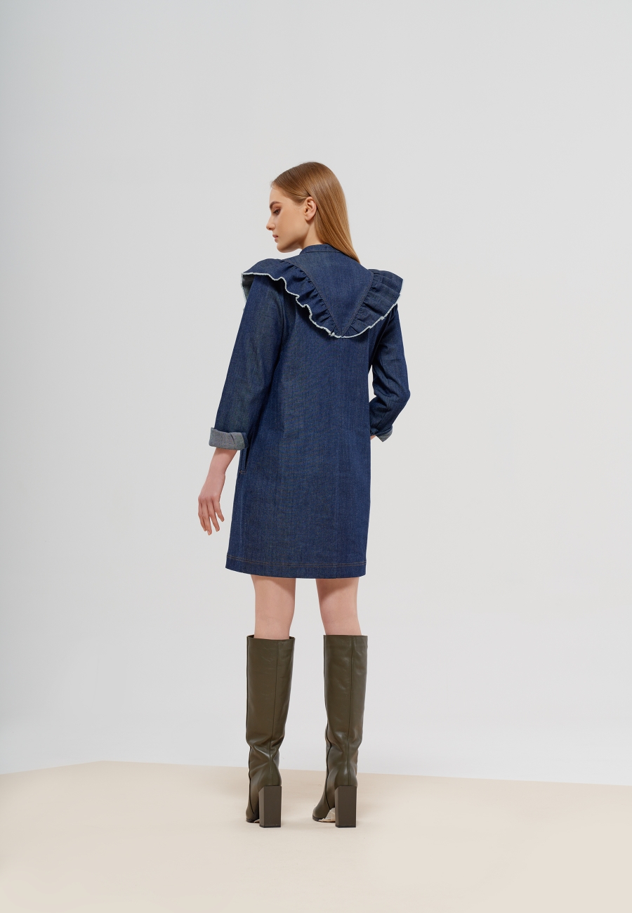 Платье женское, короткое, прямого силуэта, с втачными длинными рукавами и застегивающимися манжетами. Воротник-стойка и застежка на петли и пуговицы по планке спереди. По спинке и переду платья асимметричные подрезы с воланами. По переду платья на уровне линии бедер карманы с листочками.