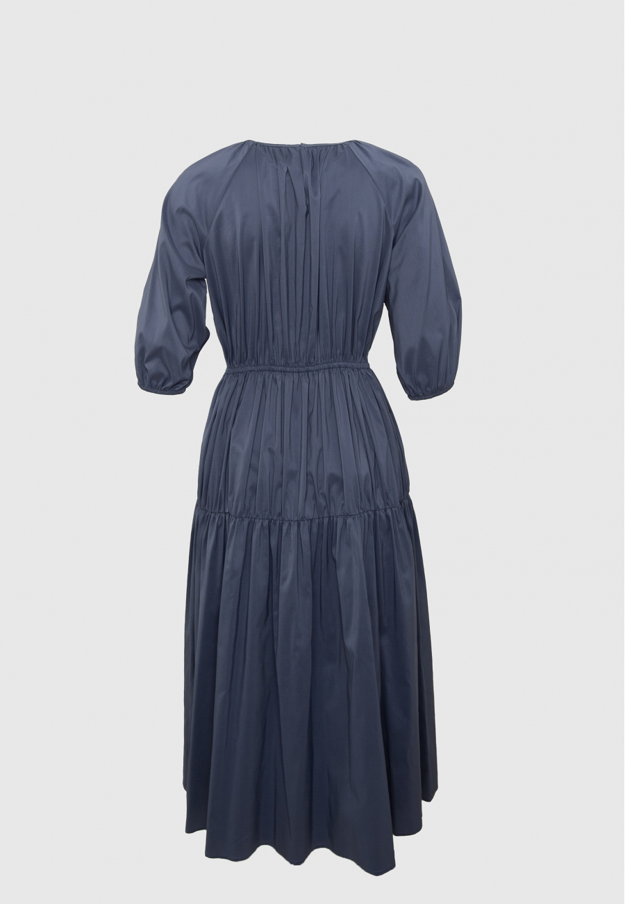 Платье женское, длиной ниже линии колен, расширенное книзу, с рукавами-реглан длиной 3/4. Горловина круглой формы .По линии горловины идет сборка, по линии талии, платье собрано на резинку. Чуть ниже линии бедер по переду и по спинке - горизонтальный подрез и сборка, идущая от линии подреза. Рукава расширенные книзу и по низу на резинке. Застежка платья на петлю и пуговицу на спинке в среднем шве.