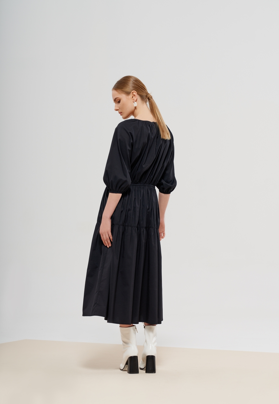 Платье женское, длиной ниже линии колен, расширенное книзу, с рукавами-реглан длиной 3/4. Горловина круглой формы .По линии горловины идет сборка, по линии талии, платье собрано на резинку. Чуть ниже линии бедер по переду и по спинке - горизонтальный подрез и сборка, идущая от линии подреза. Рукава расширенные книзу и по низу на резинке. Застежка платья на петлю и пуговицу на спинке в среднем шве.