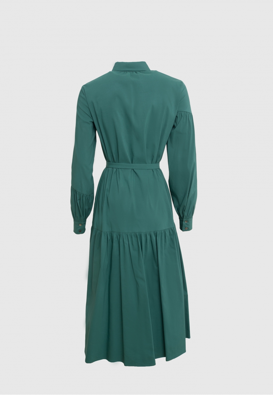 Платье из хлопка с втачными длинными рукавами, с центральной потайной застежкой. Воротник отрезной на стойке. Левая полка с накладным карманом. По переду платья и рукавам выполнены ассиметричные подрезы со сборкой. Спинка сзади со сборкой у воротника и подрезом по линии бедер. Рукава на притачной манжете на петли и пуговицы.