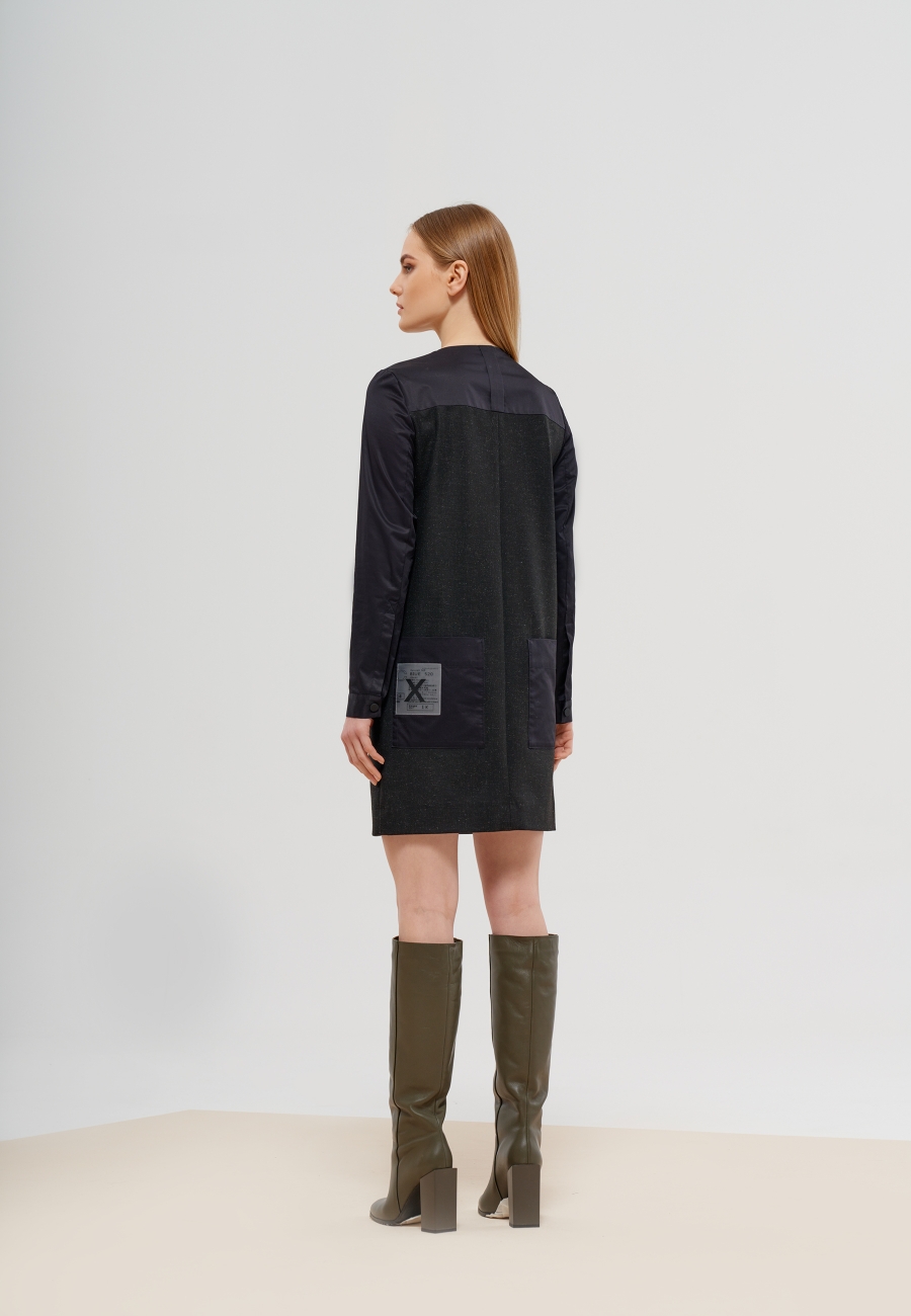 Платье женское, полуприлегающего силуэта, длиной выше линии колен, с длинными втачными рукавами. Вырез горловины платья круглой формы. По переду платья - горизонтальный подрез на уровне ниже линии талии, накладной карман на уровне линии груди и прорезные карманы по боковым швам от линии подреза. По спинке платья вверху кокетка и накладные карманы на уровне линии бедер. По низу рукавов - манжеты, застегивающиеся на кнопки. Застежка платья на кнопки по переду.
