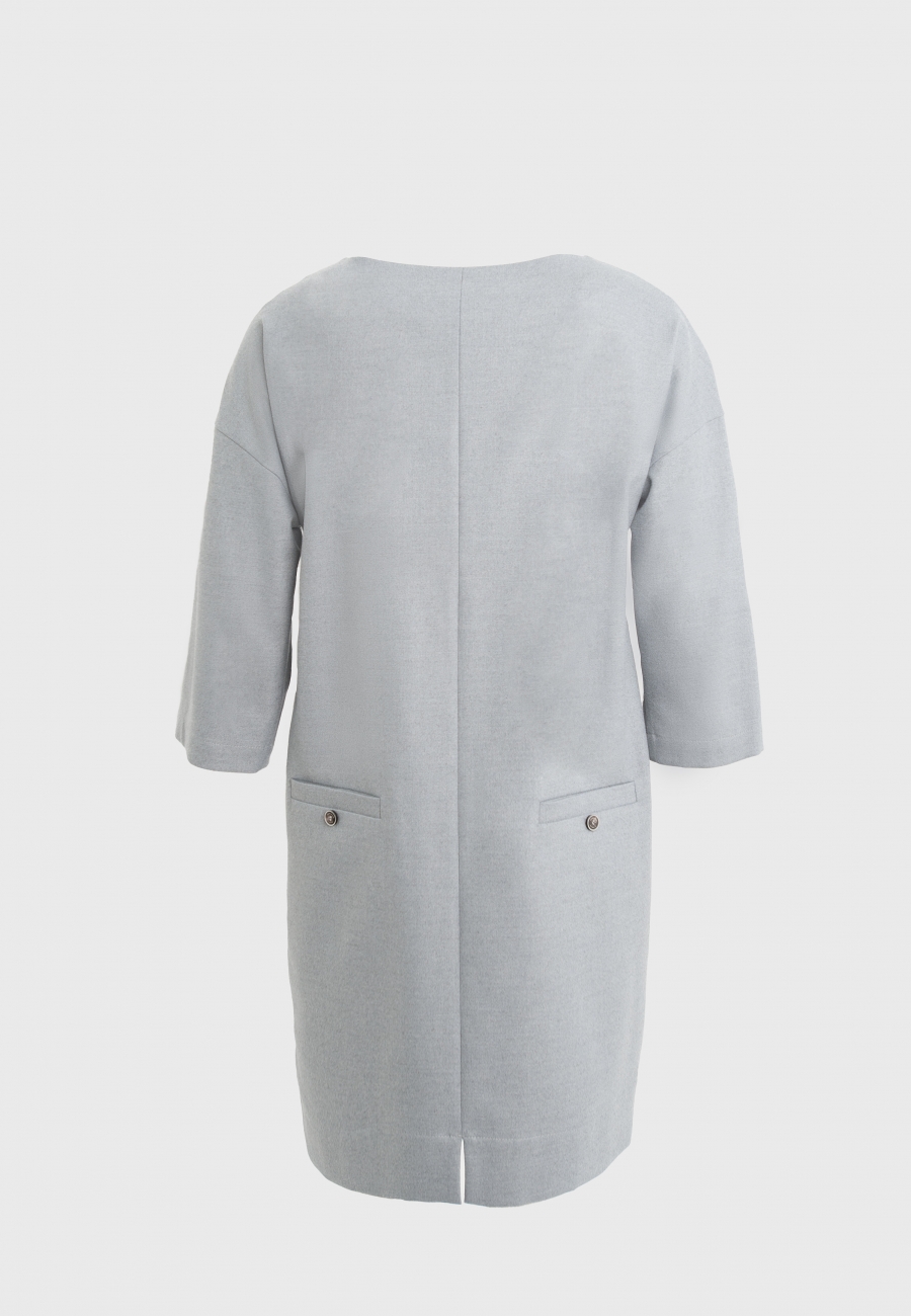 Платье женское, прямого силуэта, длиной уровень линии колен, с горловиной формой "лодочка", широкими рукавами длиной 3/4. По переду платья прорезные карманы в фигурном членении на уровне линии бедер и накладной карман на уровне линии груди. По спинке платья декоративные листочки на уровне линии бедер. Застежка на петли и пуговицы спереди по центральному шву.